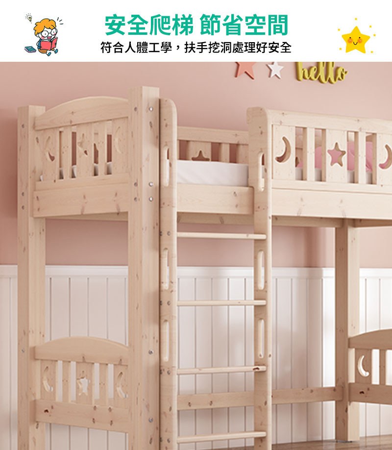 安全可靠:採用歐盟最高兒童家具專用木材等級SF級製成,堅固耐用,無毒無害,給孩子一個安全健康的睡眠環境。