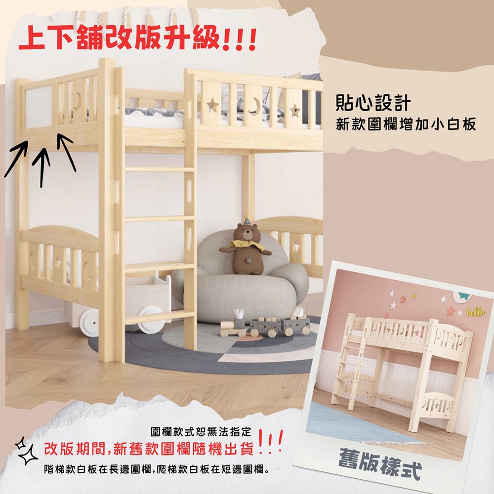 - 上鋪寬度選擇:100(標準單人)/115(單人加大)公分,讓孩子擁有充裕的睡眠空間。