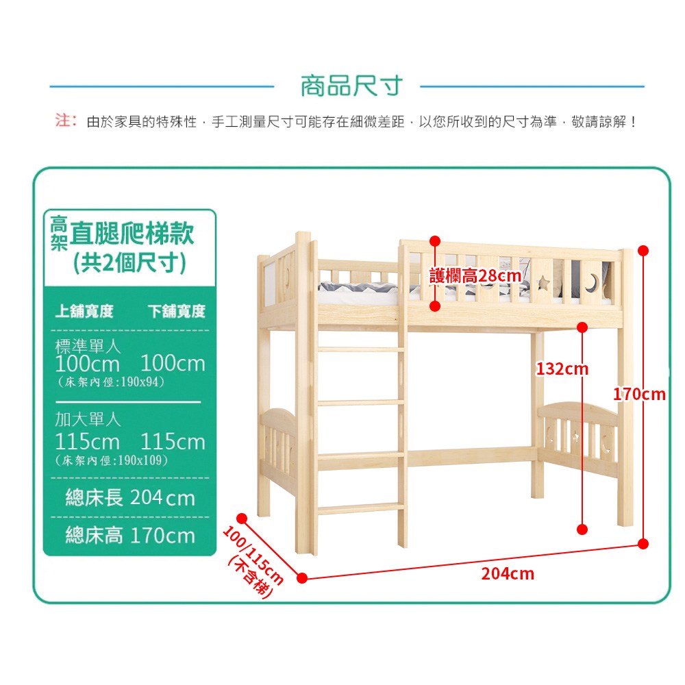 內含商品:原木-直腿高架床直梯款115床型單人加大