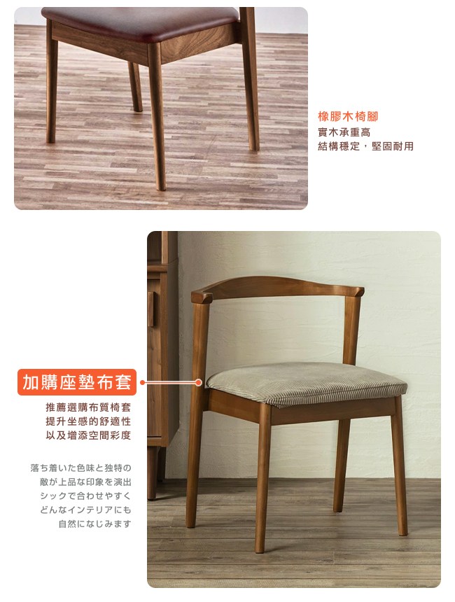 奢華使用榿木/橡膠木做餐椅,讓每一次用餐,都是饗宴。即使是讀書、辦公,或喝杯咖啡閒話家常,這充滿魅力品味的餐桌椅,將令人印象深刻。曲木椅背,貼合背部曲線,放鬆依靠,坐感舒適。半扶手設計,極簡風格,不佔空間。實木扶手方便雙手支撐,省力入座、起身。PVC 防潑水,座墊清潔容易,不易殘留髒污。橡膠木椅腳,實木承重高、結構穩定,堅固耐用。