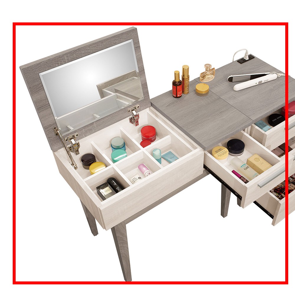 林氏木業北歐原木風抽屜櫃附鏡可伸縮化妝桌組 UE1C (附妝凳 JF1H) (H014378516)