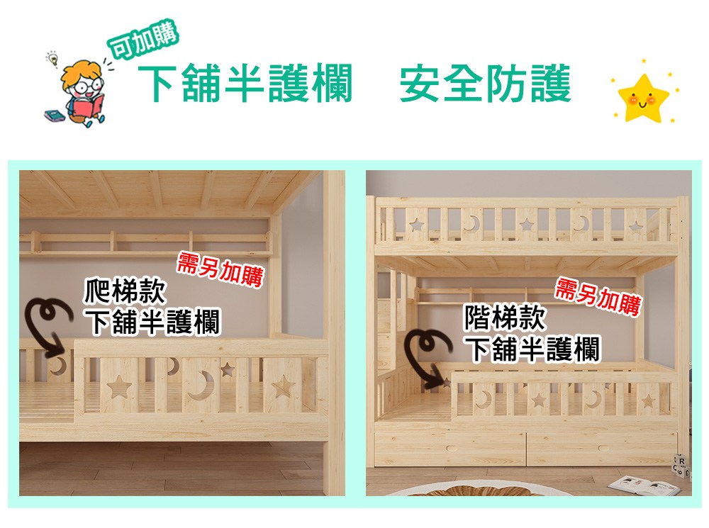 安全可靠:採用歐盟最高兒童家具專用木材等級SF級製成,堅固耐用,無毒無害,給孩子一個安全健康的睡眠環境。