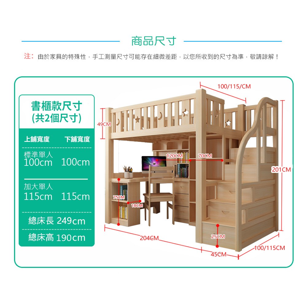 床架寬度115公分,床總長度249公分,床總高度201公分 。