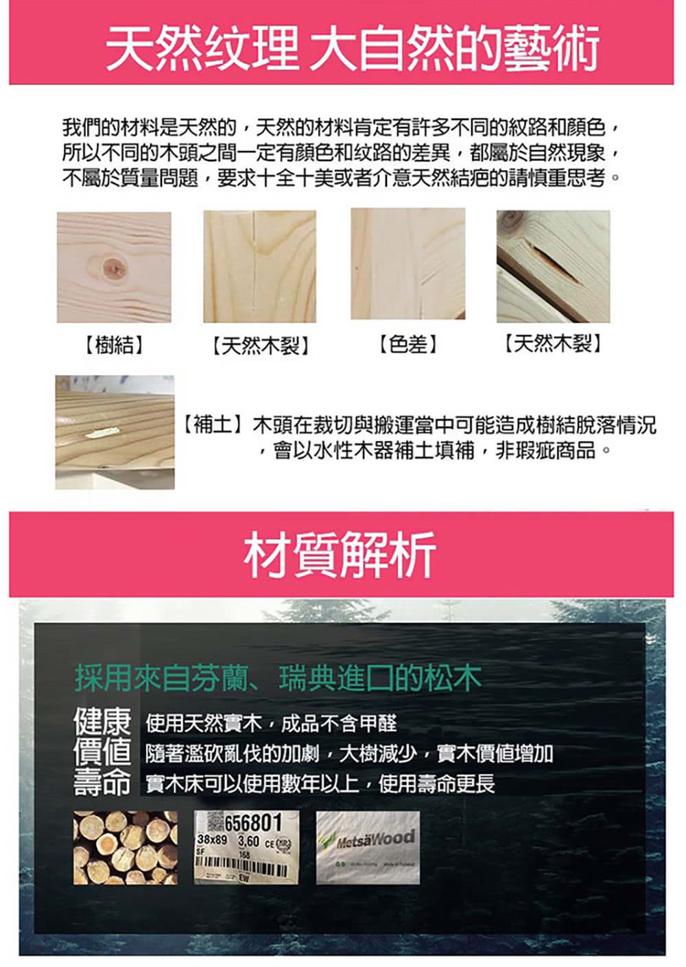 正統台灣工法製造,採用瑞典、芬蘭進口的松木,實木原木打磨,堅固耐用。
