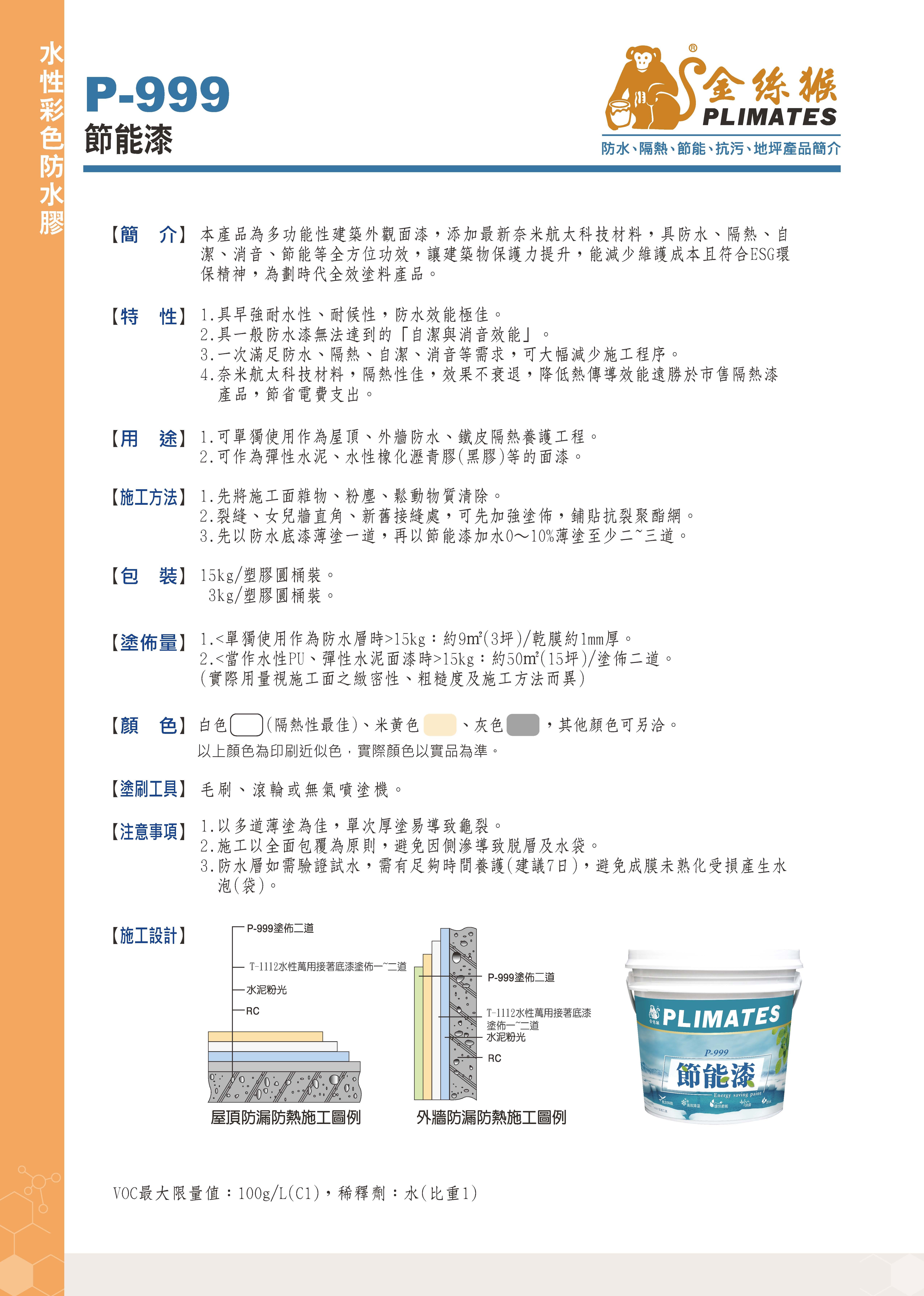PLIMATES 金絲猴 水性防水隔熱面漆 P-701 灰色 4kg 1桶