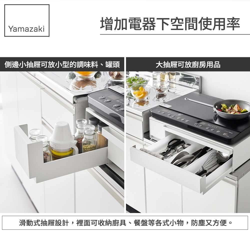 創新的滑動式抽屜設計,裡面可收納廚具、餐盤等各式小物,防塵又方便。