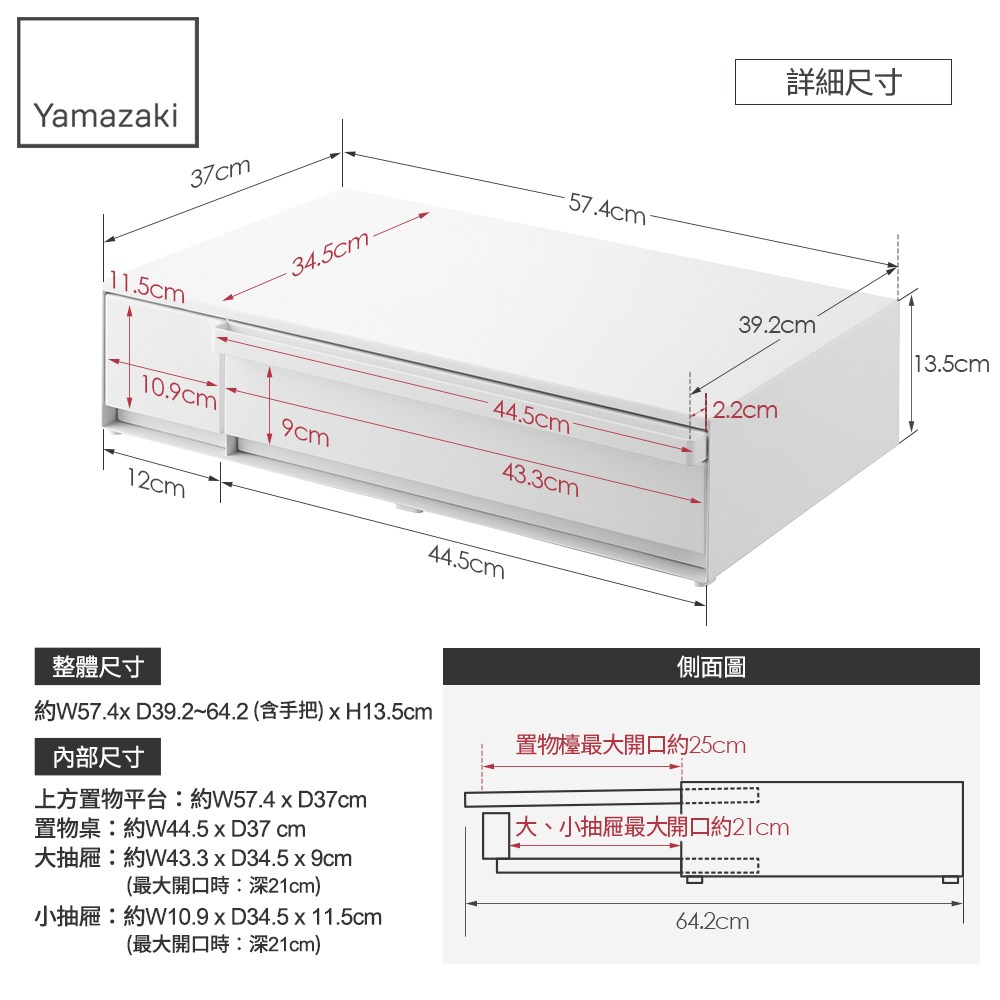 ★耐重:上方頂板約:20kg;抽屜、置物檯約:3kg(頂板上放置重量超過2kg的物品