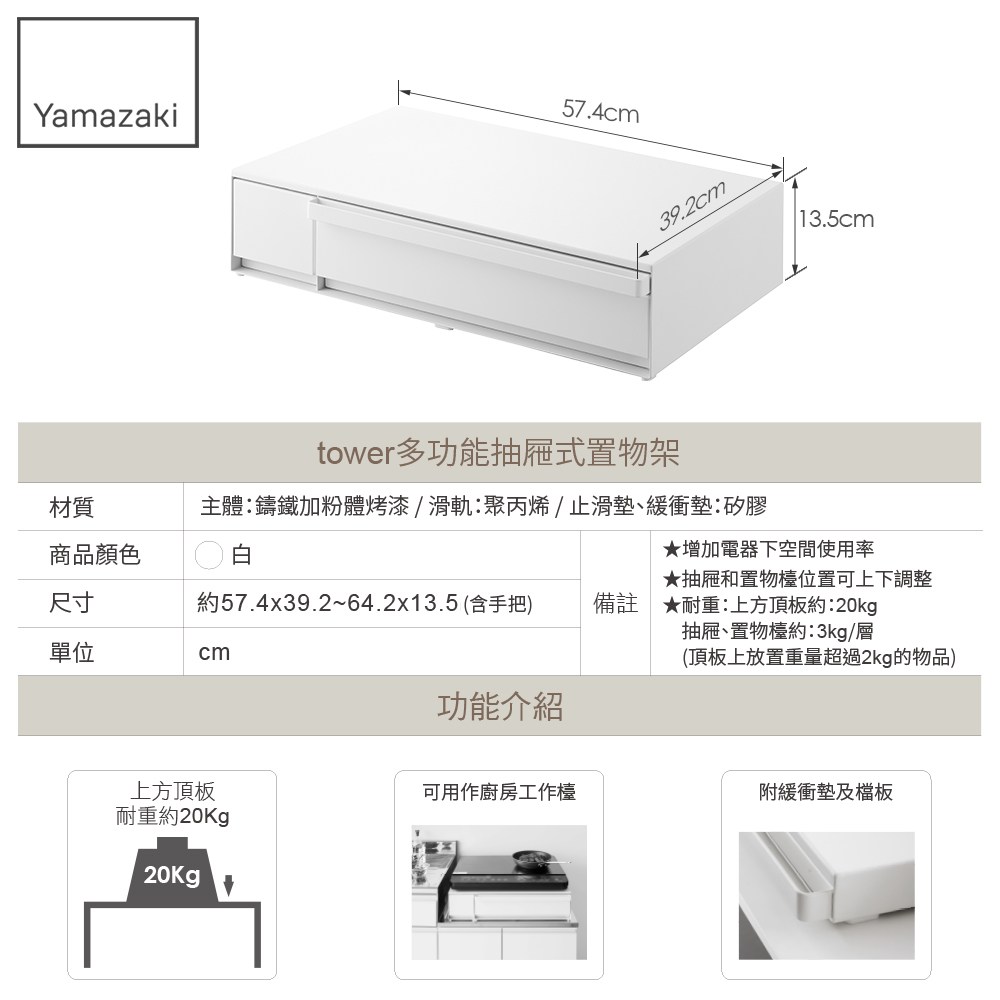 上方耐重約20kg,烤箱、電子鍋等小家電都能放,是增加收納空間提高效率首選好幫手。
