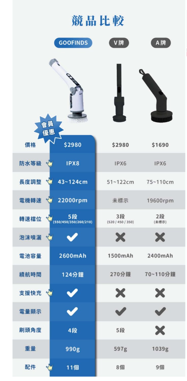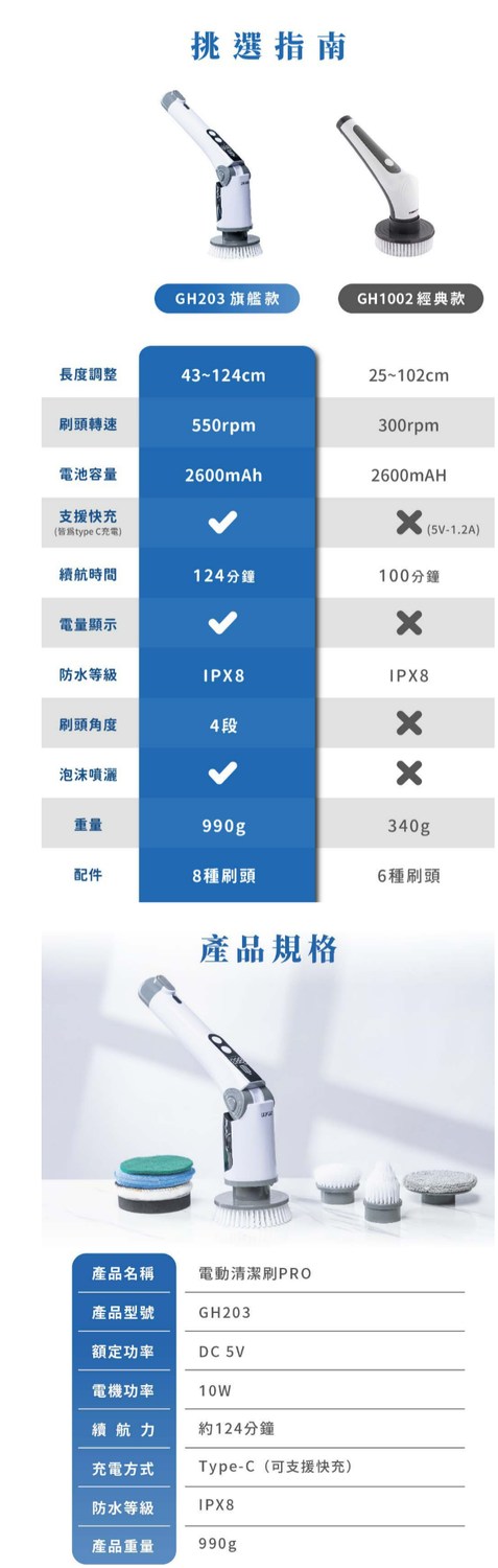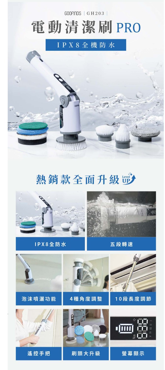 GOOFINDS 「IPX8全防水」電動清潔刷PRO GH203(5段轉速/ 泡沫噴灑/ 刷地板/ 刷浴室