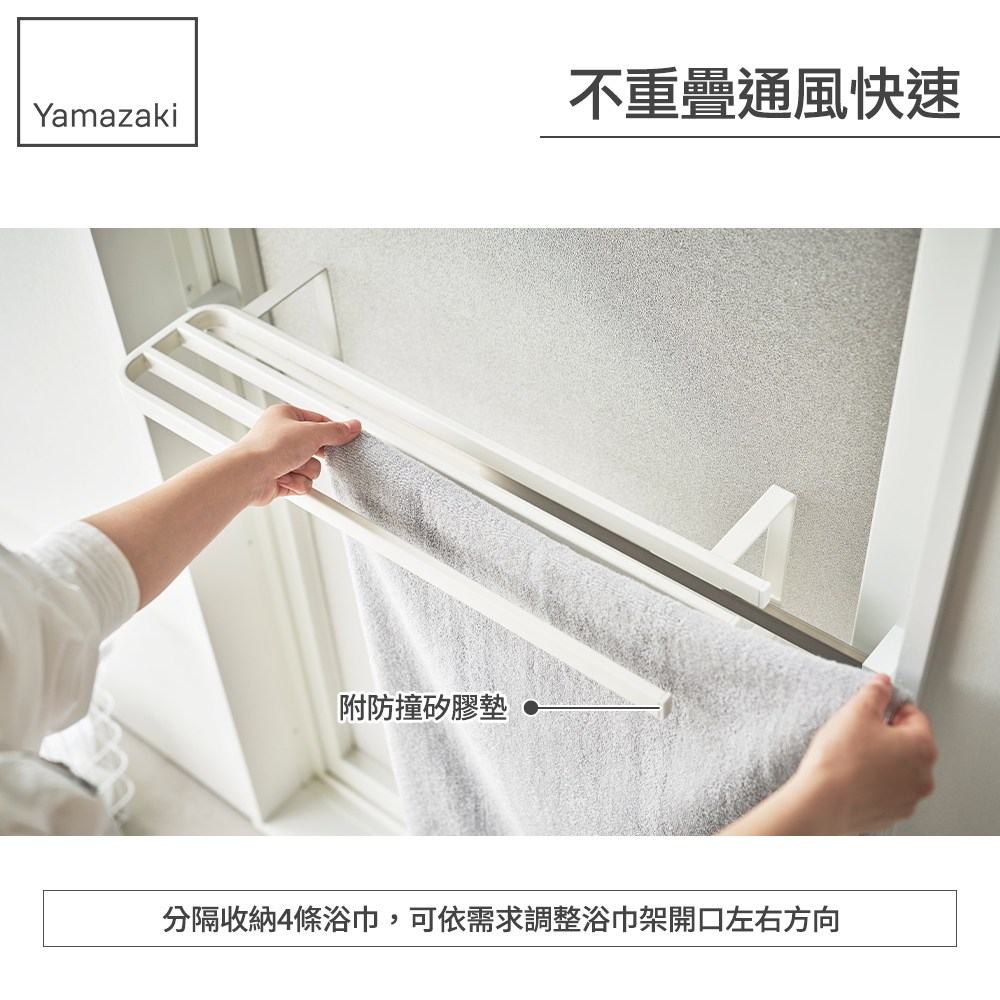 分隔收納4條浴巾,不重疊通風快速。可依需求調整浴巾架開口左右方向,讓拿取更方便。