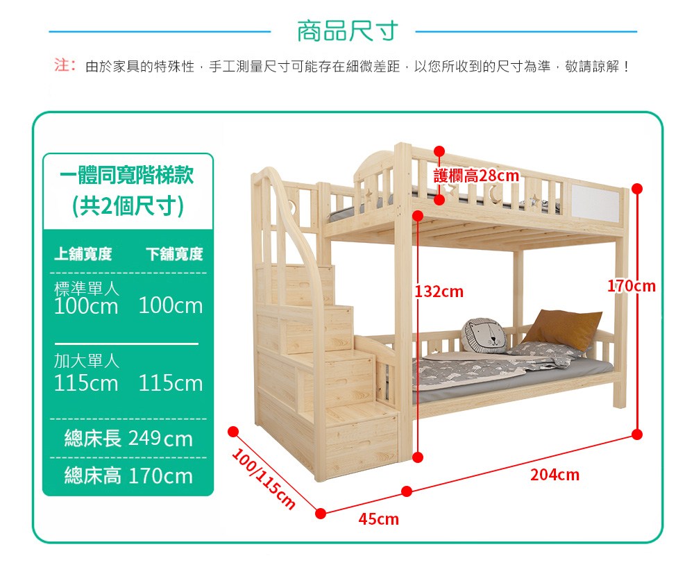 上鋪寬度115公分,下鋪寬度115公分,總長度204公分,床總高度170公分