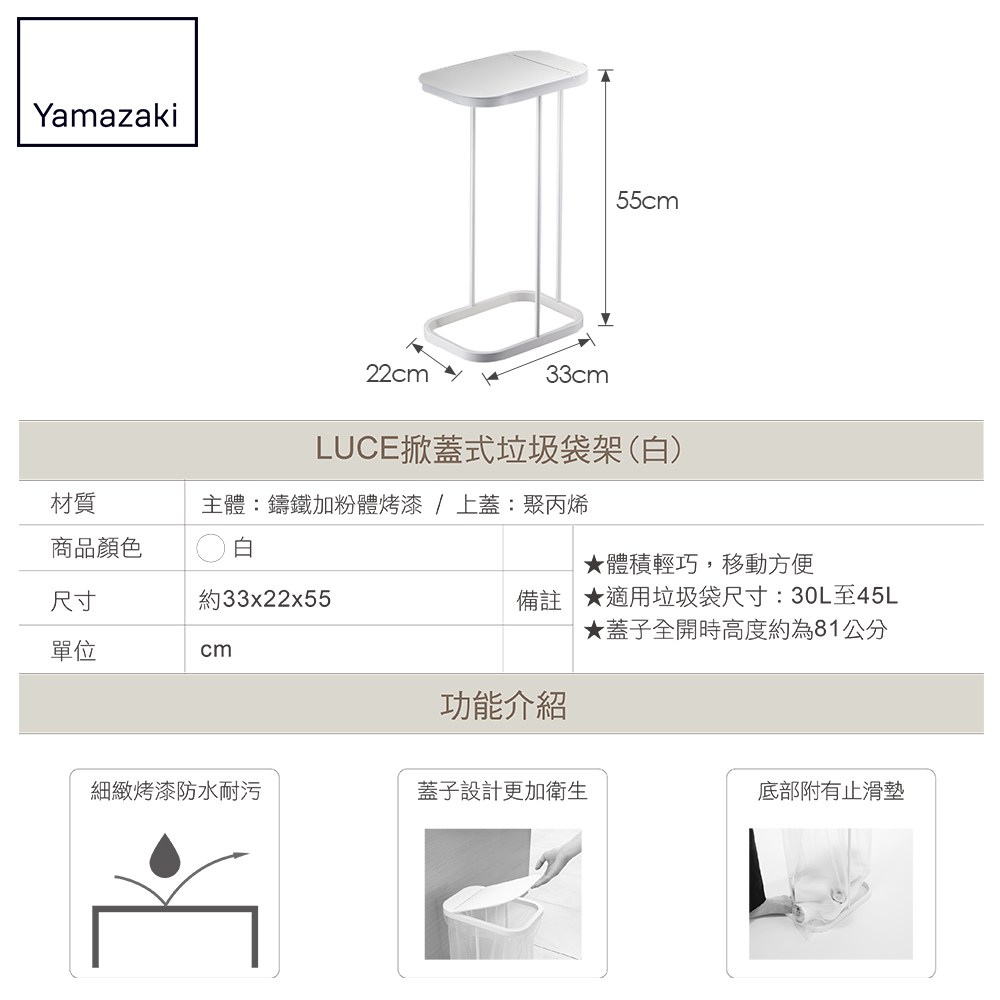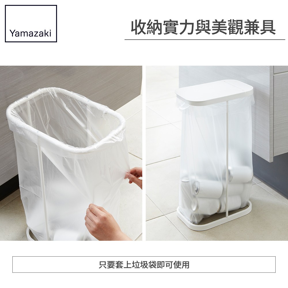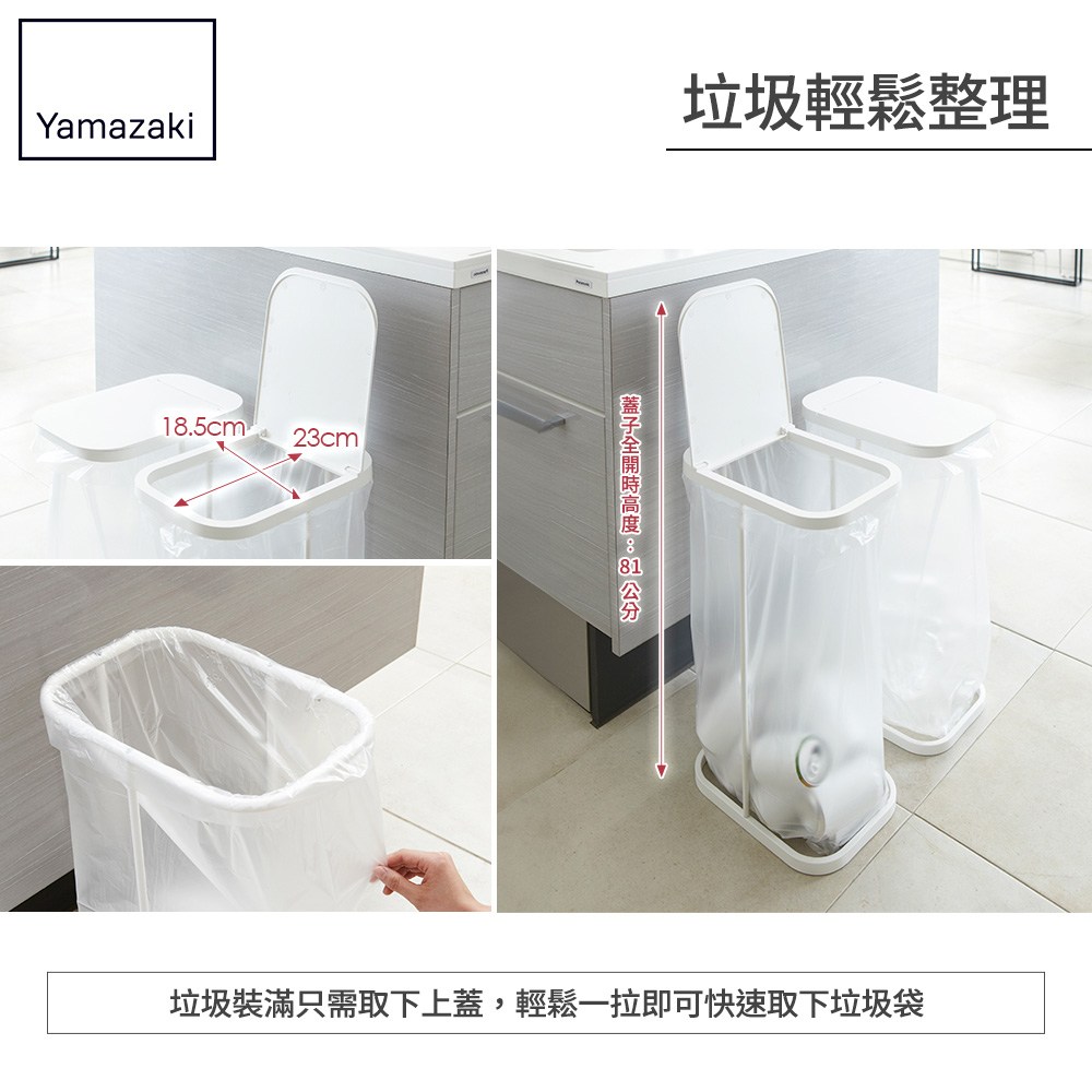 只要套上垃圾袋即可使用,簡單構造無桶設計不受垃圾容量大小限制,能讓垃圾袋使用到每一寸。