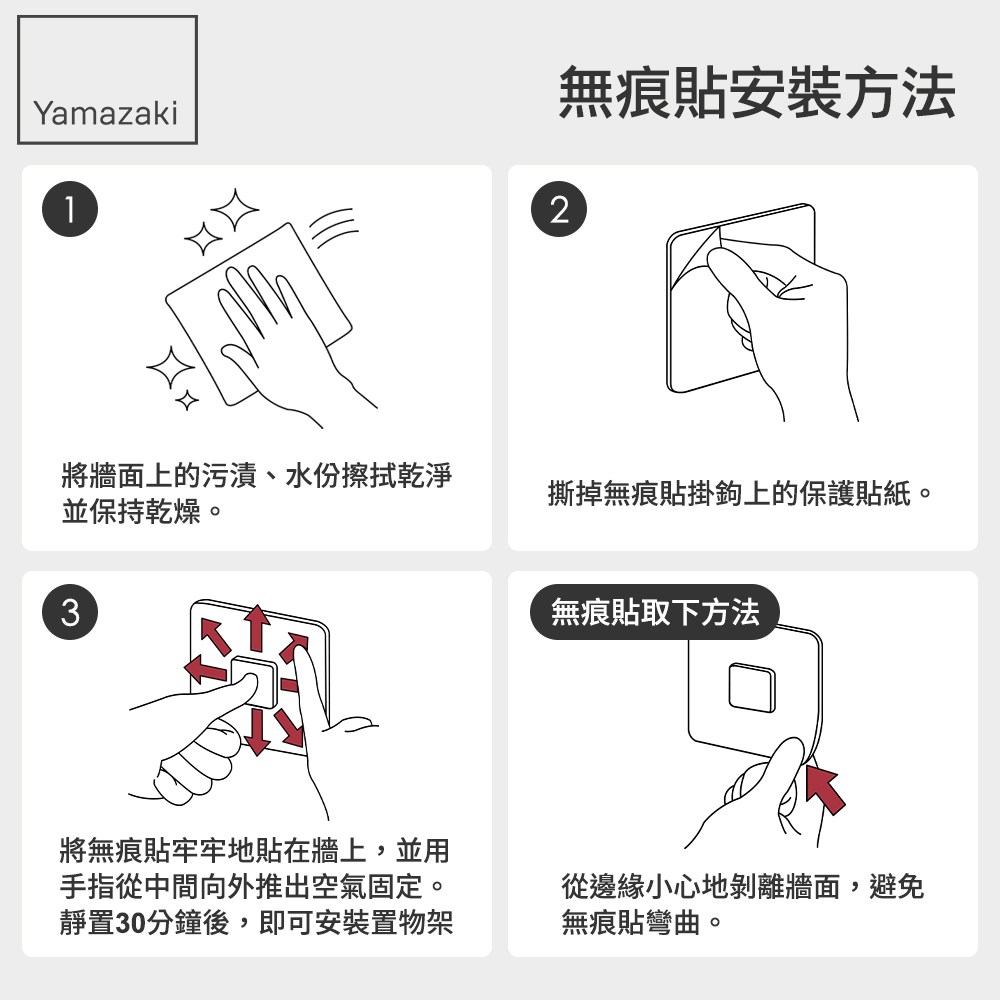 無痕貼設計不易傷害牆面,還可重複安裝使用。