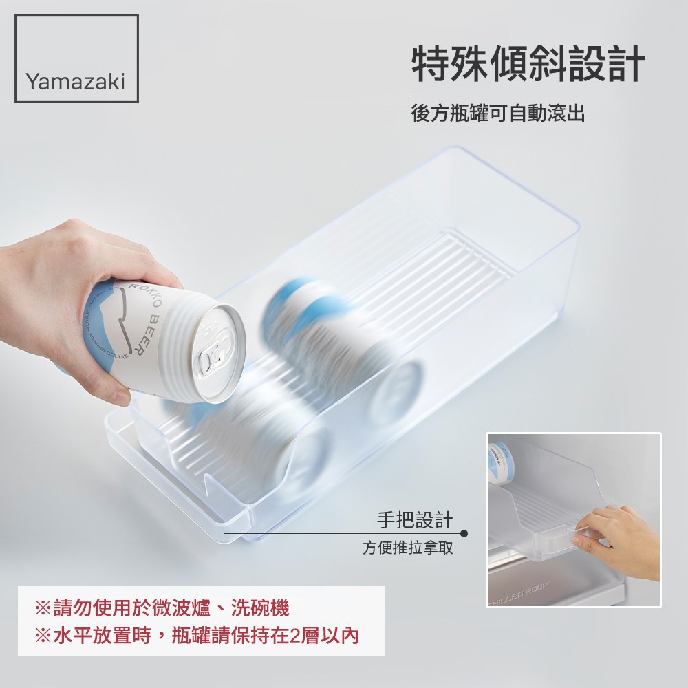 上層開口造型,瓶罐可直橫兩用放置,尺寸不侷限。特殊傾斜設計,後方瓶罐可自動滾出,手把設計好拉取,物品拿取更easy!