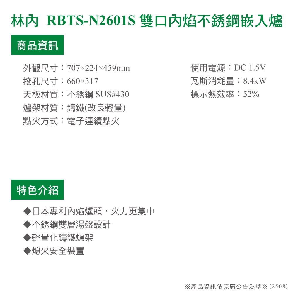 [林內] RBTS-N2601S雙口內焰不銹鋼嵌入爐_天然NG1天然瓦斯