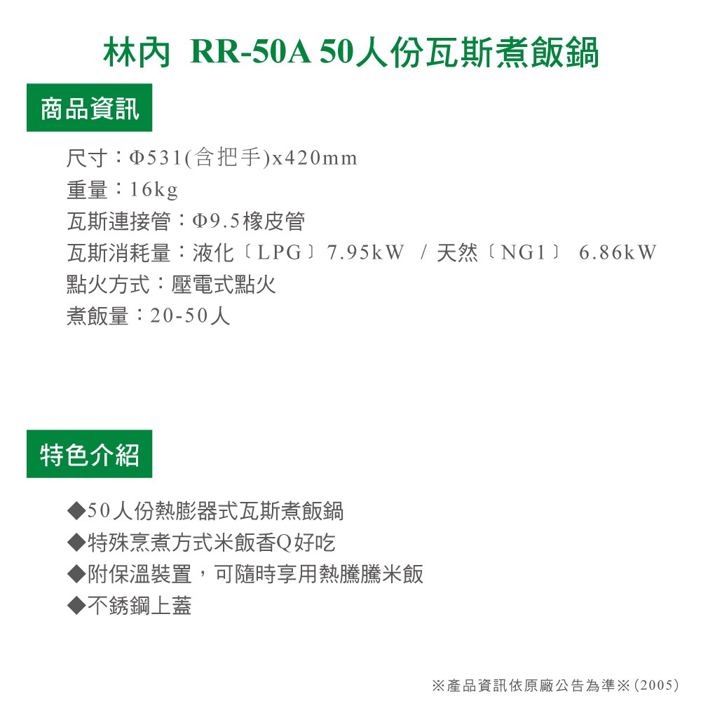 (全省安裝)林內50人份瓦斯煮飯鍋免熱脹器桶裝瓦斯用(與RR-50S1同款)飯鍋RR-50S1_LPG