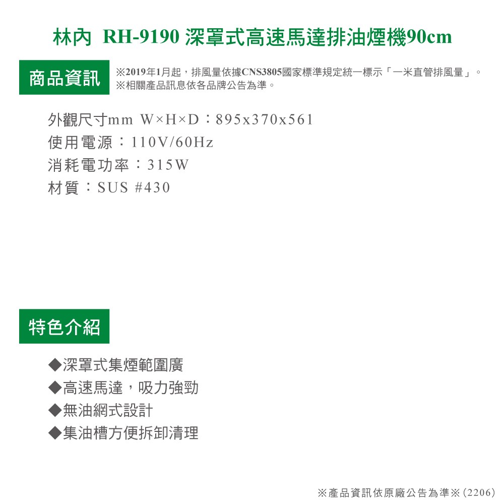 林內深罩式高速馬達排油煙機90cm RH-9190 合格瓦斯承裝業 全省免費基本安裝(偏遠鄉鎮及離島另計)