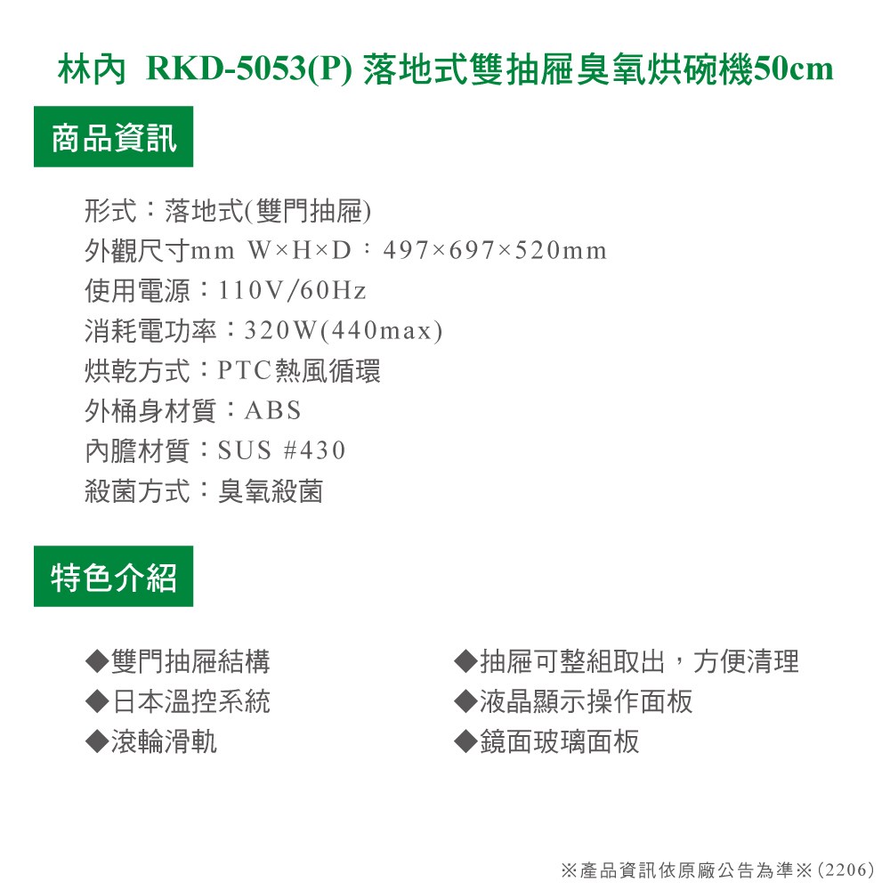 (含標準安裝)林內【RKD-6053(P)】落地烘碗機(雙門抽屜/臭氧/60cm)