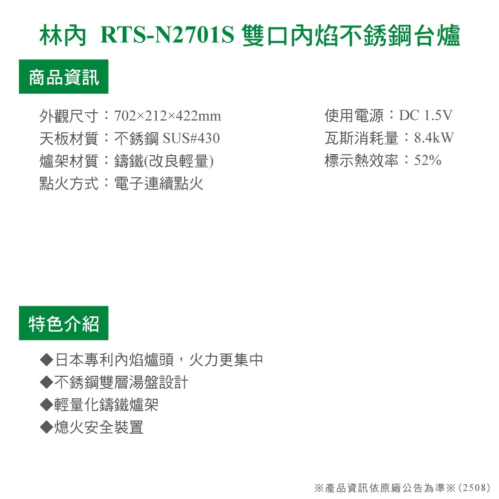 (全省安裝)林內雙口爐內焰台爐不鏽鋼瓦斯爐天然氣RTS-N2701S-NG1