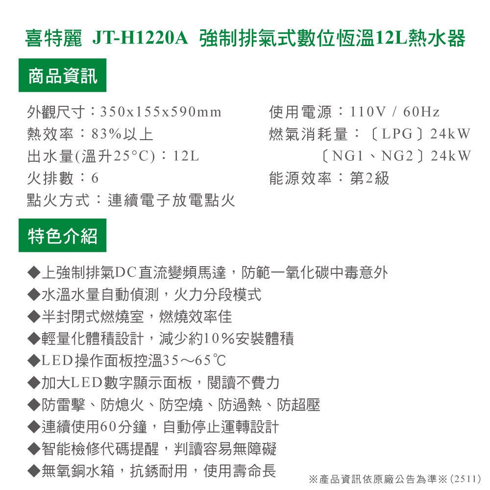 [喜特麗] JT-H1220A強制排氣式數位恆溫12L熱水器_天然NG1/FE式天然瓦斯