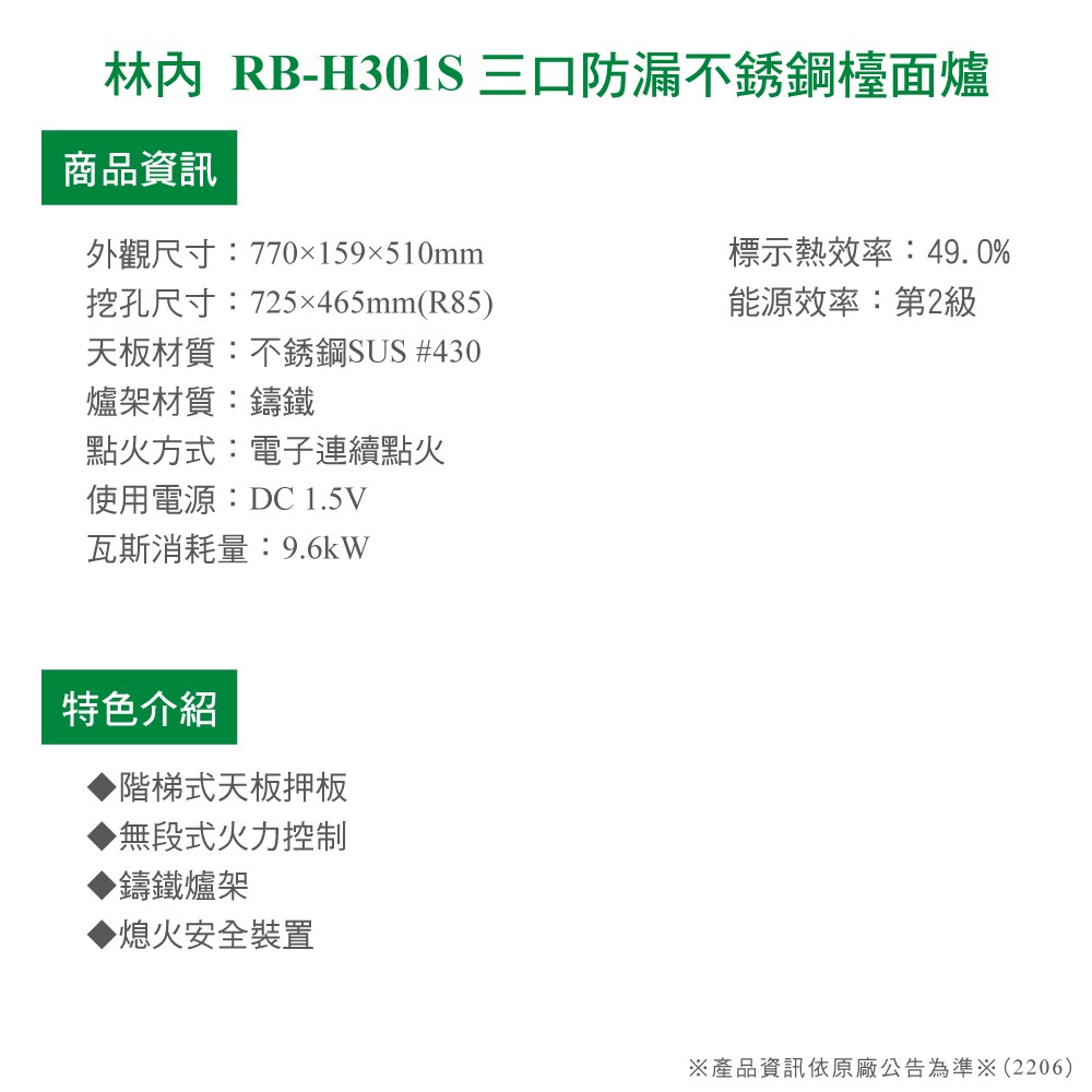 (全省安裝)林內三口檯面爐防漏爐不鏽鋼鑄鐵爐架(與RB-H301S同款)瓦斯爐RB-H301S_NG1