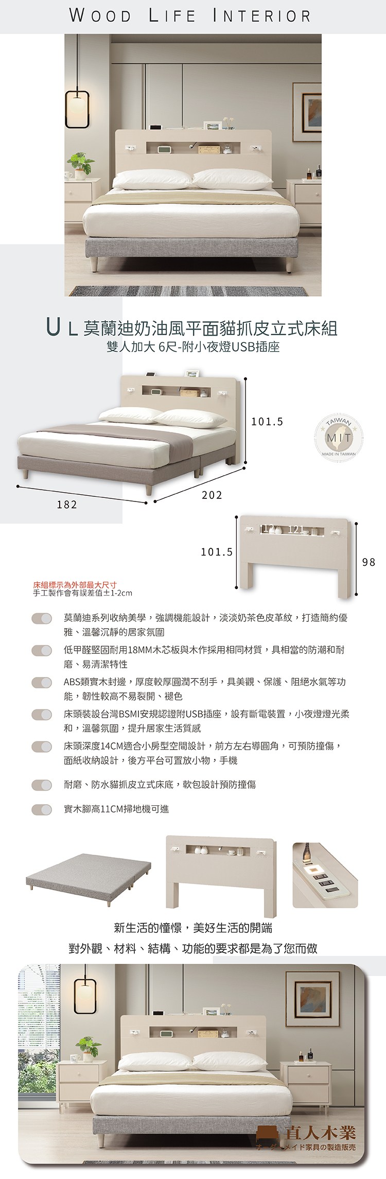直人木業-UL莫蘭迪奶油風收納貓抓皮立式床組-雙人加大6尺