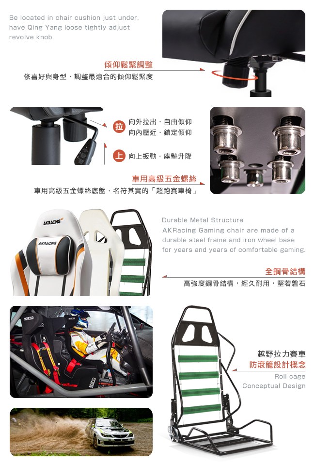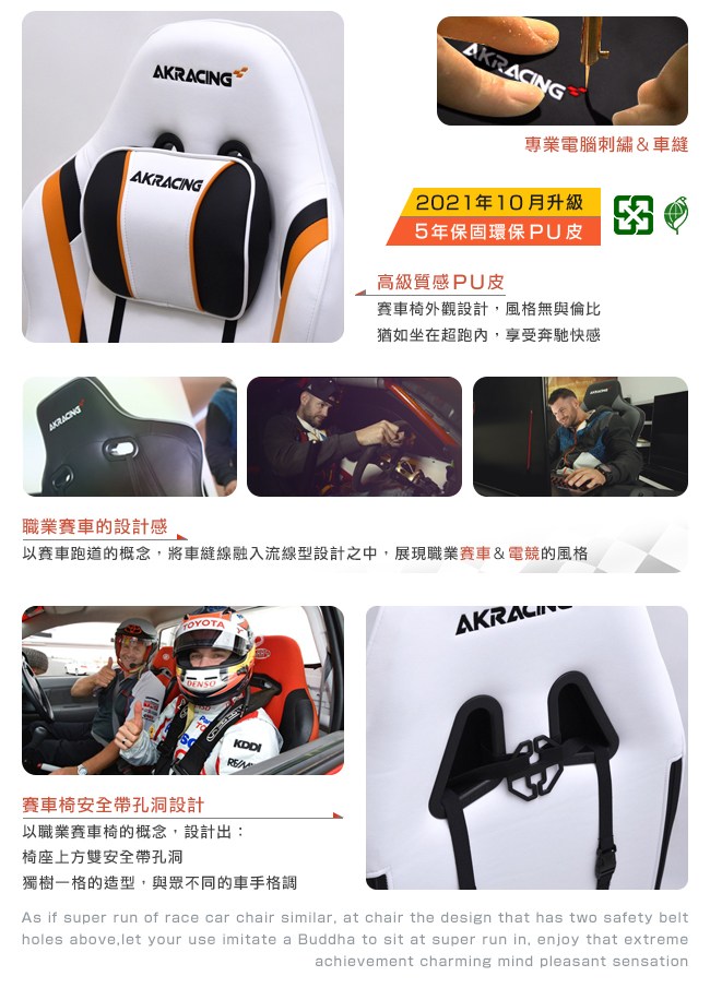 AKRACING 倡導時尚前衛,引領電競遊戲、超跑賽車、辦公等各領域的座椅設計潮流,注重新型、環保材質的引進。嚴格控制製作過程中的所有細節,完美融合現代科技理論與生產實踐。經過不斷的發展,AKRACING 擁有了一批極富創意的設計師,和技術精湛的專業製作團隊。