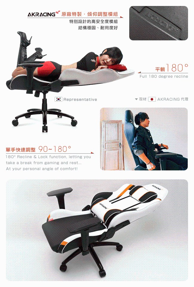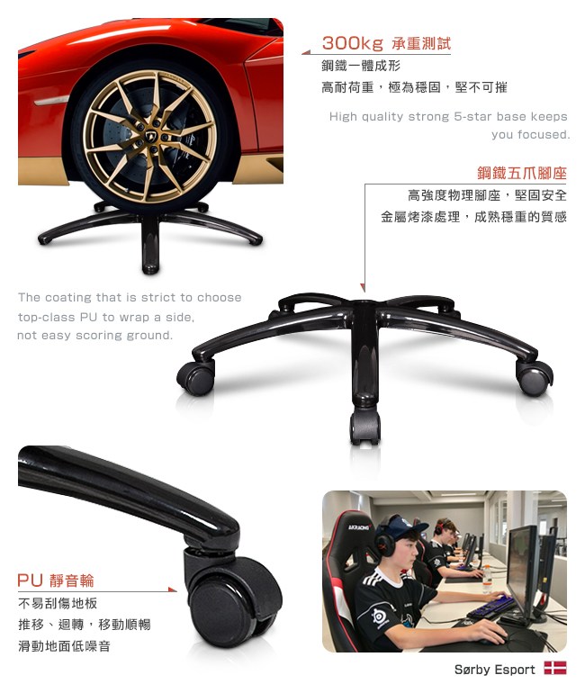 獨創 180 度平躺功能,座椅穩固不傾倒。人性化、無段式調節椅背傾仰角度,提供舒適的遊戲、辦公坐姿。成型泡綿柔軟回彈性好,經過 500kg 瞬間反覆沖壓 10,000 次以上,完美抗壓,依然彈性十足。鋼骨椅架與鋼鐵五爪腳座,高承重設計,外觀金屬烤漆,成熟穩重的質感。PU靜音輪不易刮傷地板,滑動地面低噪音,移動自如。