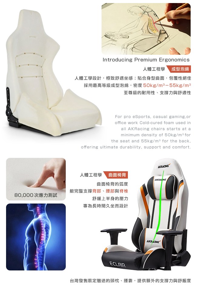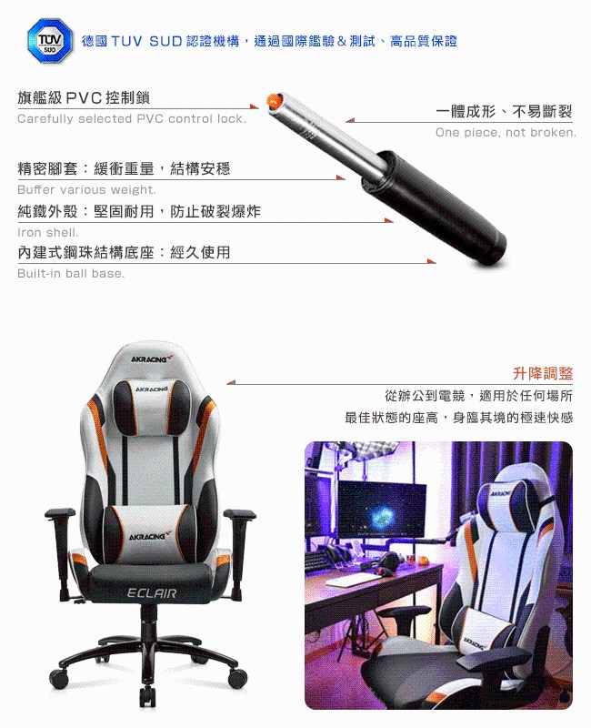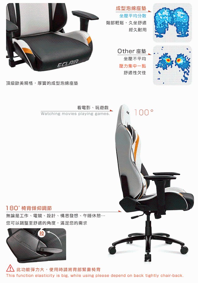 通過國際 SGS、德國 TUV SUD 安全認證。外銷歐美、日韓、亞洲、南美、紐澳等 40 餘國,廣受專業人士的歡迎,更是各國職業電競賽事的專用座椅。搭配人體工學、頂級環保 PU 皮、高彈力成型泡綿,讓人體和座面之間,緊密貼合在一起。完美的包覆感,分散壓力,久坐不累,達到放鬆的效果。