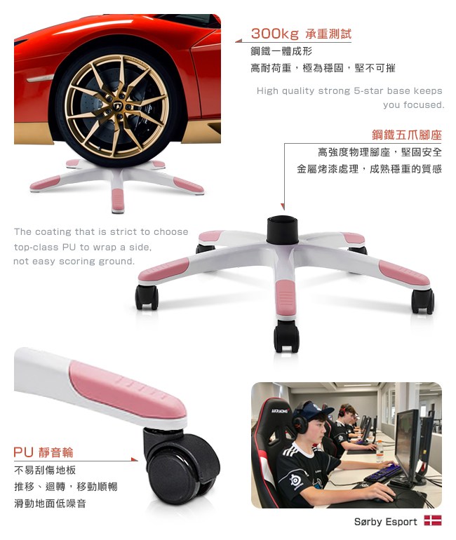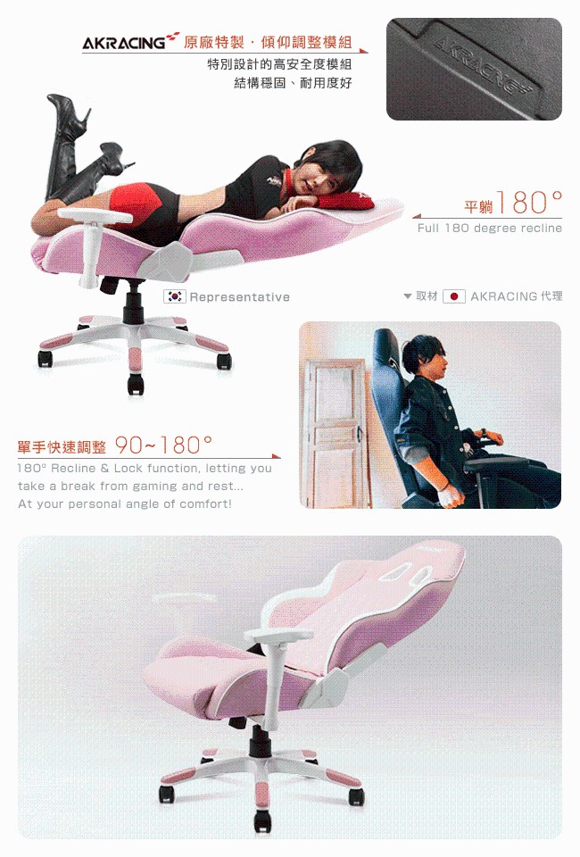 獨創 180 度平躺功能,座椅穩固不傾倒。人性化、無段式調節椅背傾仰角度,提供舒適的遊戲、辦公坐姿。成型泡綿柔軟回彈性好,經過 500kg 瞬間反覆沖壓 10,000 次以上,完美抗壓,依然彈性十足。鋼骨椅架與鋼鐵五爪腳座,高承重設計,外觀金屬烤漆,成熟穩重的質感。PU靜音輪不易刮傷地板,滑動地面低噪音,移動自如。
