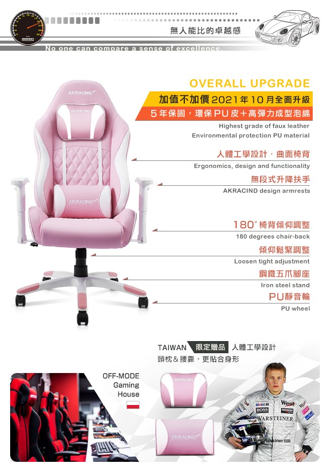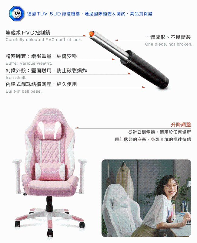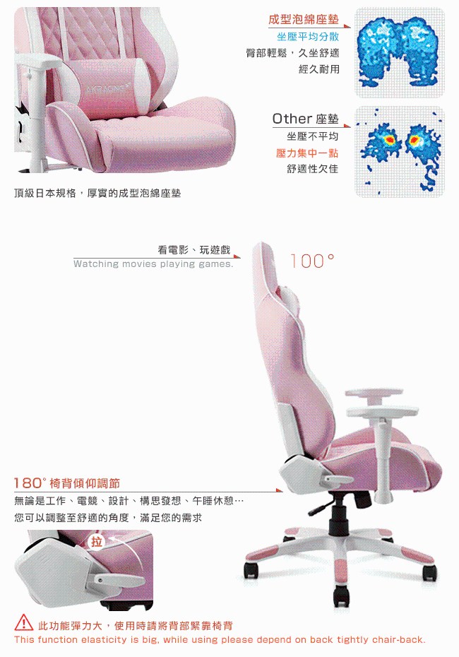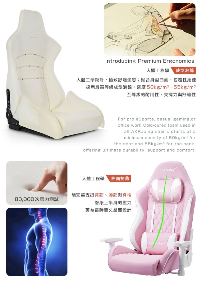 通過國際 SGS、德國 TUV SUD 安全認證。外銷歐美、日韓、亞洲、南美、紐澳等 40 餘國,廣受專業人士的歡迎,更是各國職業電競賽事的專用座椅。搭配人體工學、頂級環保 PU 皮、高彈力成型泡綿,讓人體和座面之間,緊密貼合在一起。完美的包覆感,分散壓力,久坐不累,達到放鬆的效果。