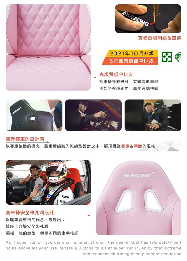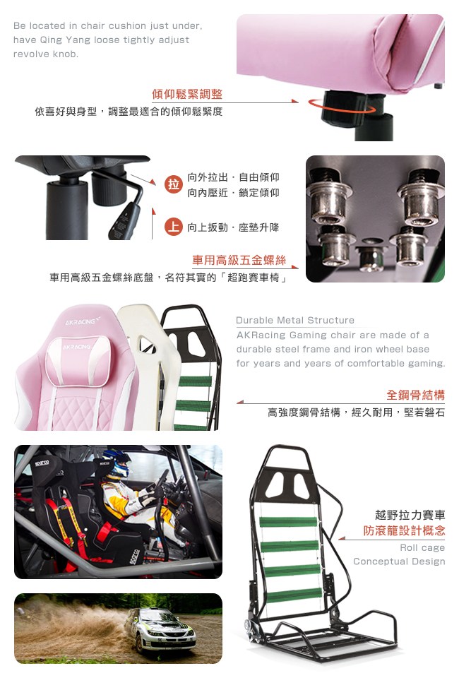AKRACING 倡導時尚前衛,引領電競遊戲、超跑賽車、辦公等各領域的座椅設計潮流,注重新型、環保材質的引進。嚴格控制製作過程中的所有細節,完美融合現代科技理論與生產實踐。經過不斷的發展,AKRACING 擁有了一批極富創意的設計師,和技術精湛的專業製作團隊。