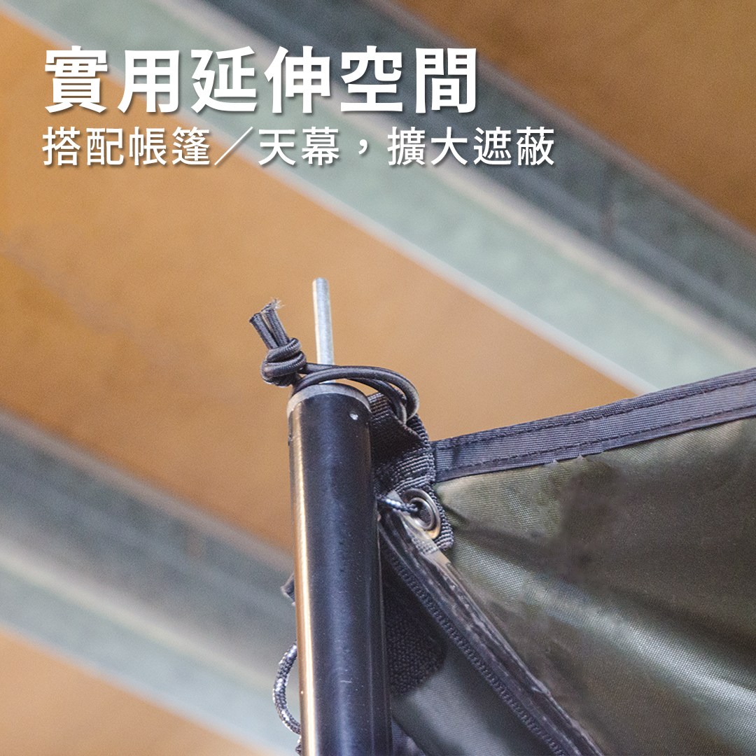 若購買帳篷或是天幕布,可使用前庭撐桿,把前庭撐高,增加帳篷使用空間。