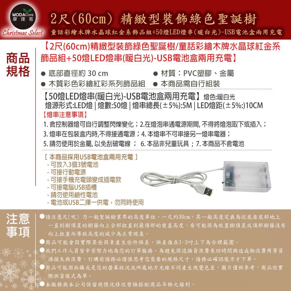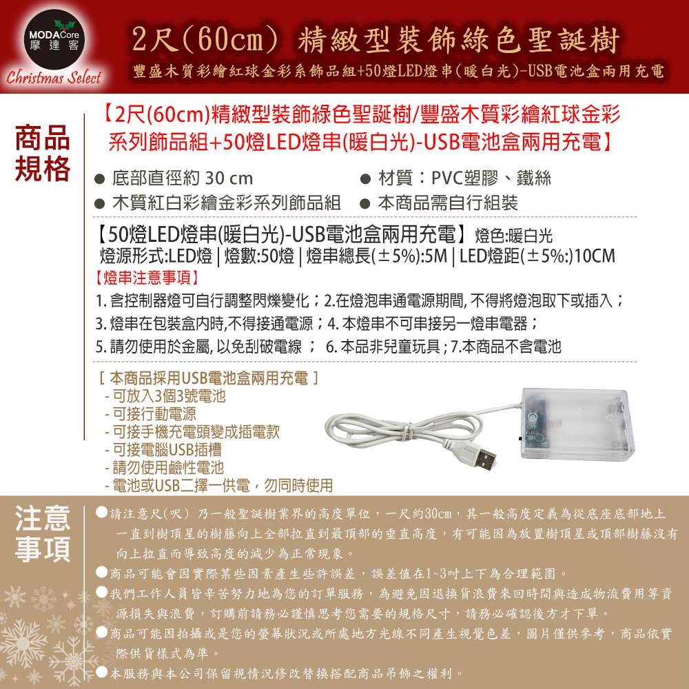 摩達客-2尺豪華綠色聖誕樹・浪漫星願紅金套組+3米鈴鐺松果燈串暖白光-USB控制器