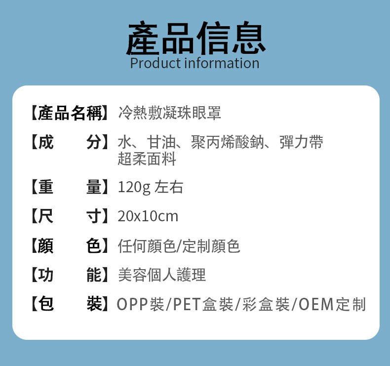 - 材質:凝膠珠(水、甘油等)+ 超柔面料 + 彈力帶
