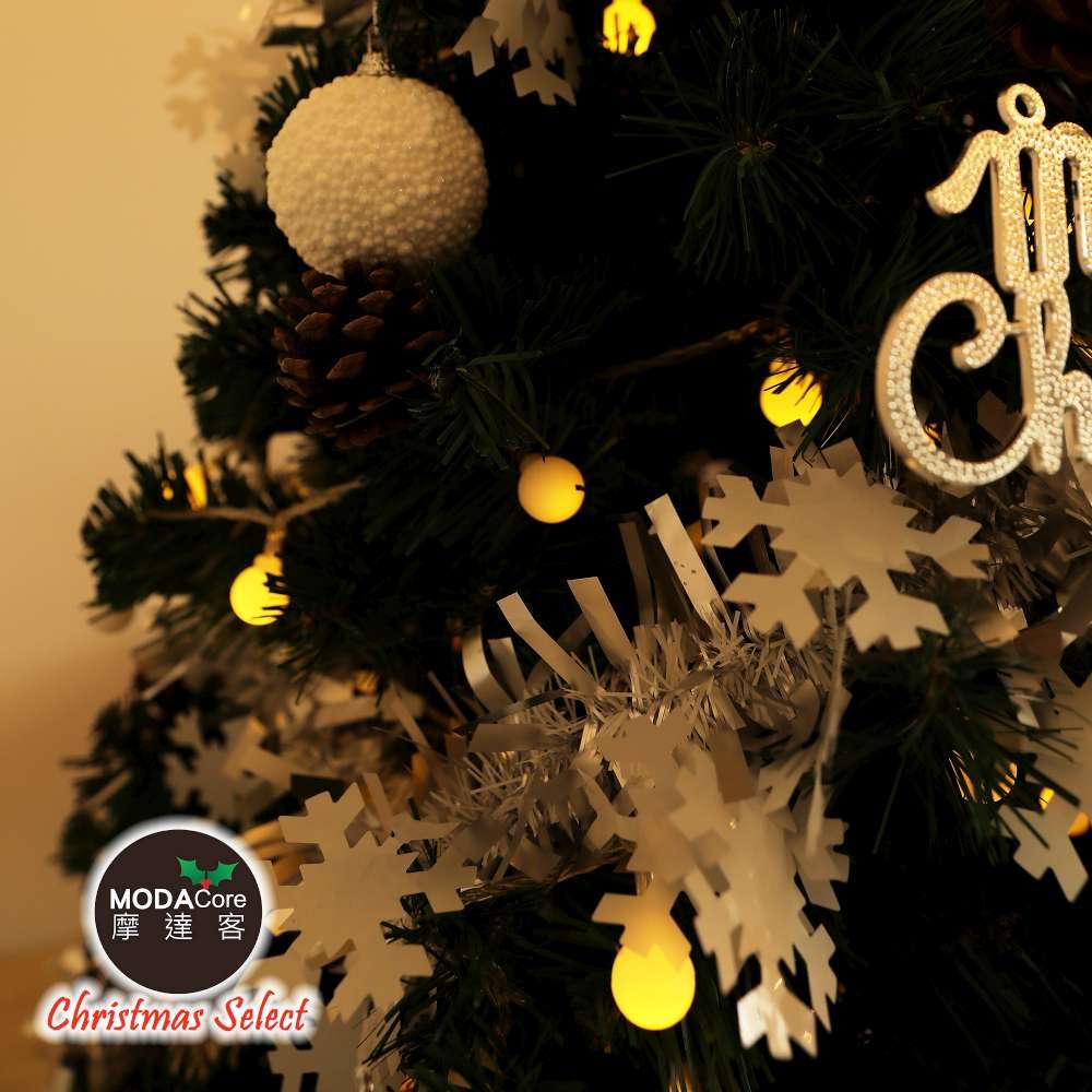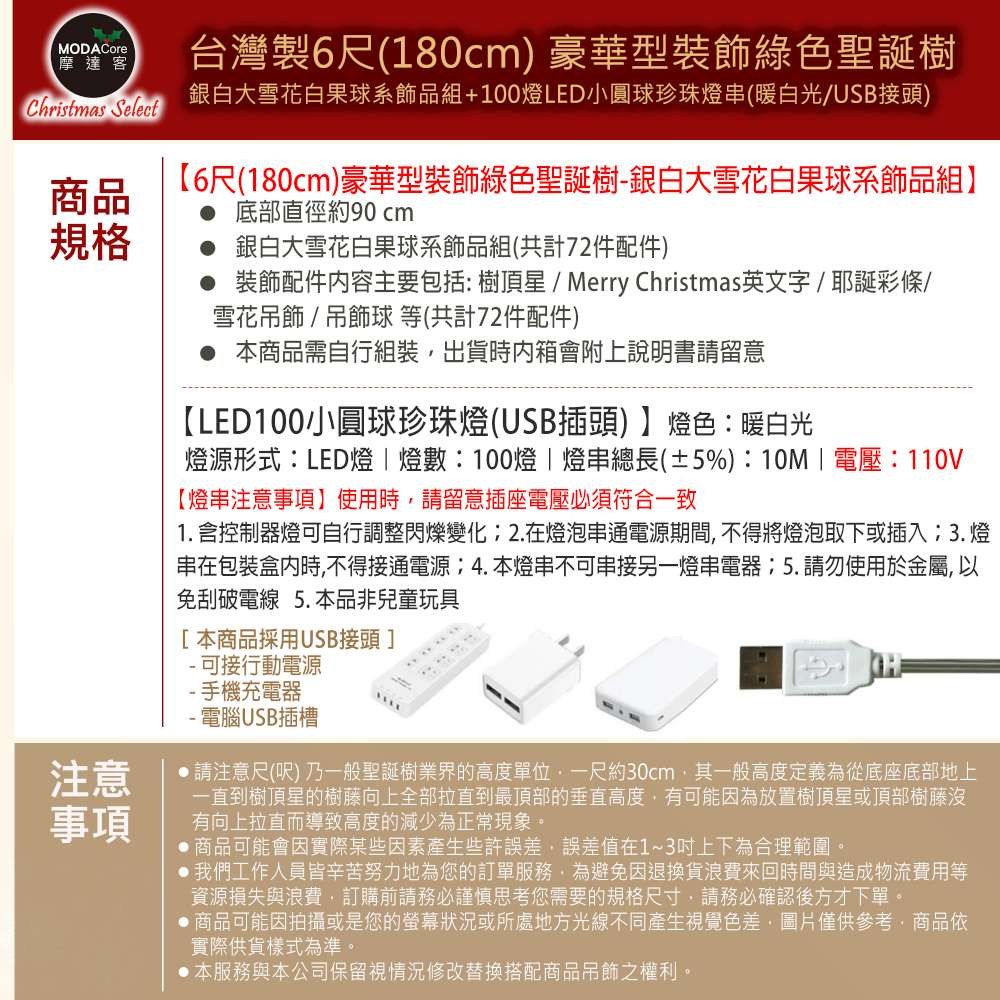 摩達客 台灣製6尺(180cm) 豪華型裝飾綠色聖誕樹 銀白大雪花白果球系全套飾品組+100燈LED小圓球珍珠燈串(暖白光)