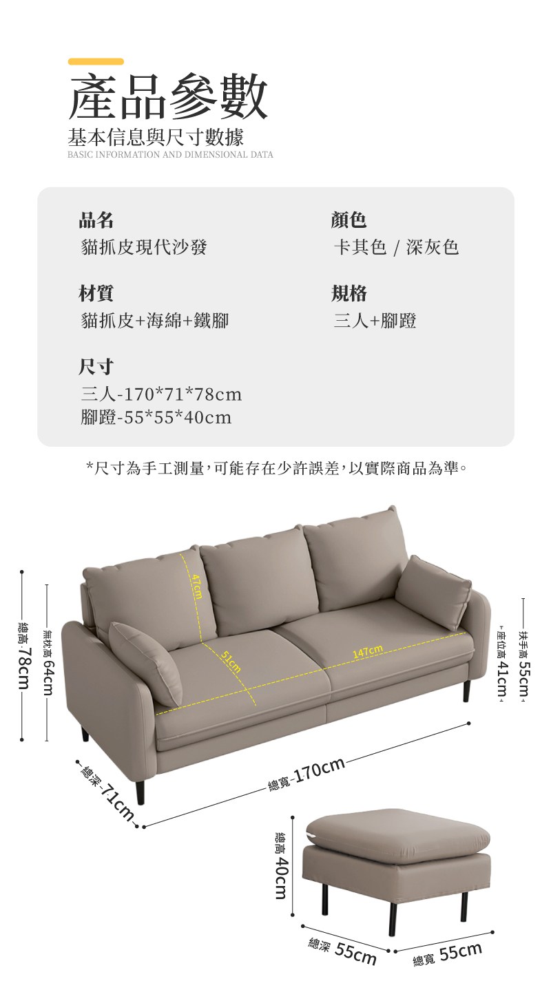 文創集 亞迪耐磨貓抓布三人座沙發椅-206x87x92cm免組