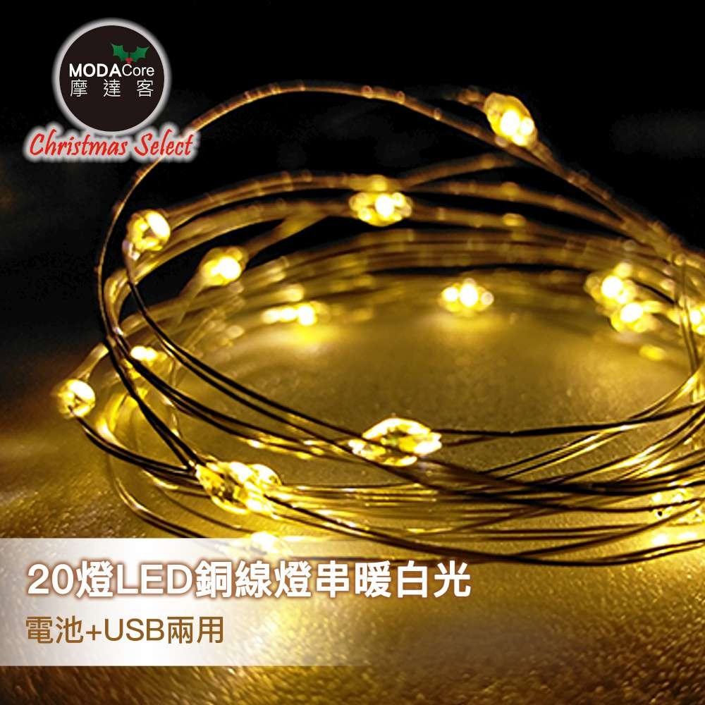 摩達客 1尺裝飾聖誕樹(木質雪花系)+LED20燈銅線燈(暖白光)(USB電池兩用充電)