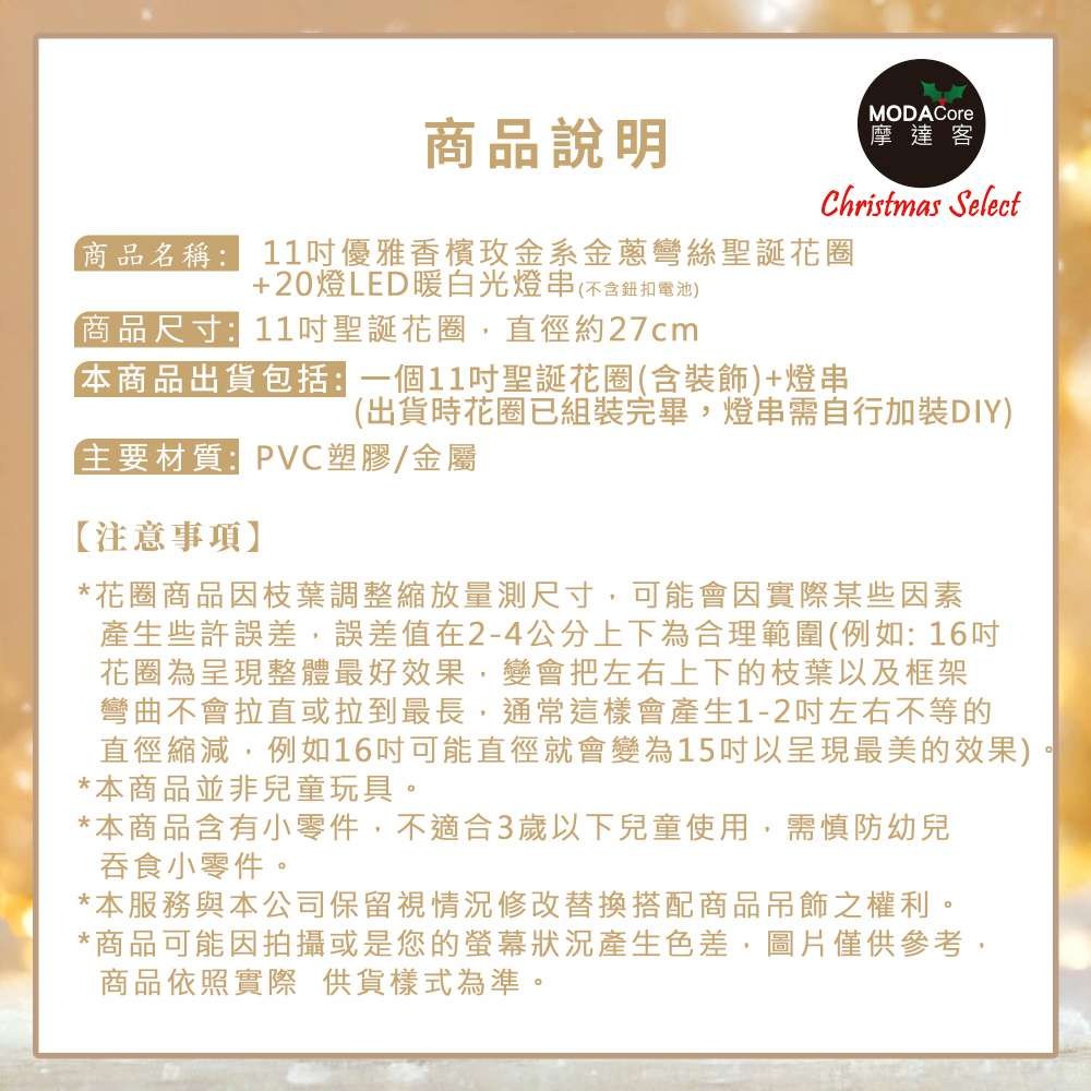 摩達客 11吋優雅香檳玫金系金蔥彎絲聖誕花圈+20燈LED暖白光燈串 本島免運費