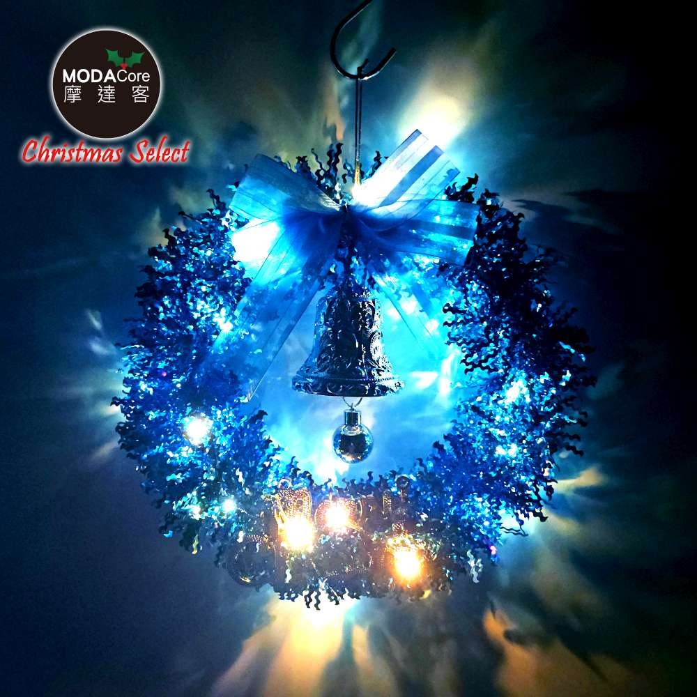 摩達客11吋夢幻土耳其藍系金蔥彎絲聖誕花圈+20燈LED暖白光燈串_本島免運費