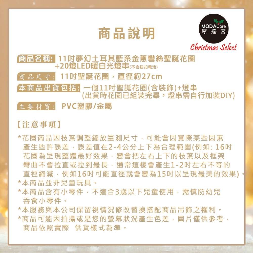 摩達客11吋夢幻土耳其藍系金蔥彎絲聖誕花圈+20燈LED暖白光燈串_廠商直送
