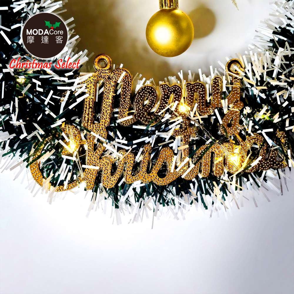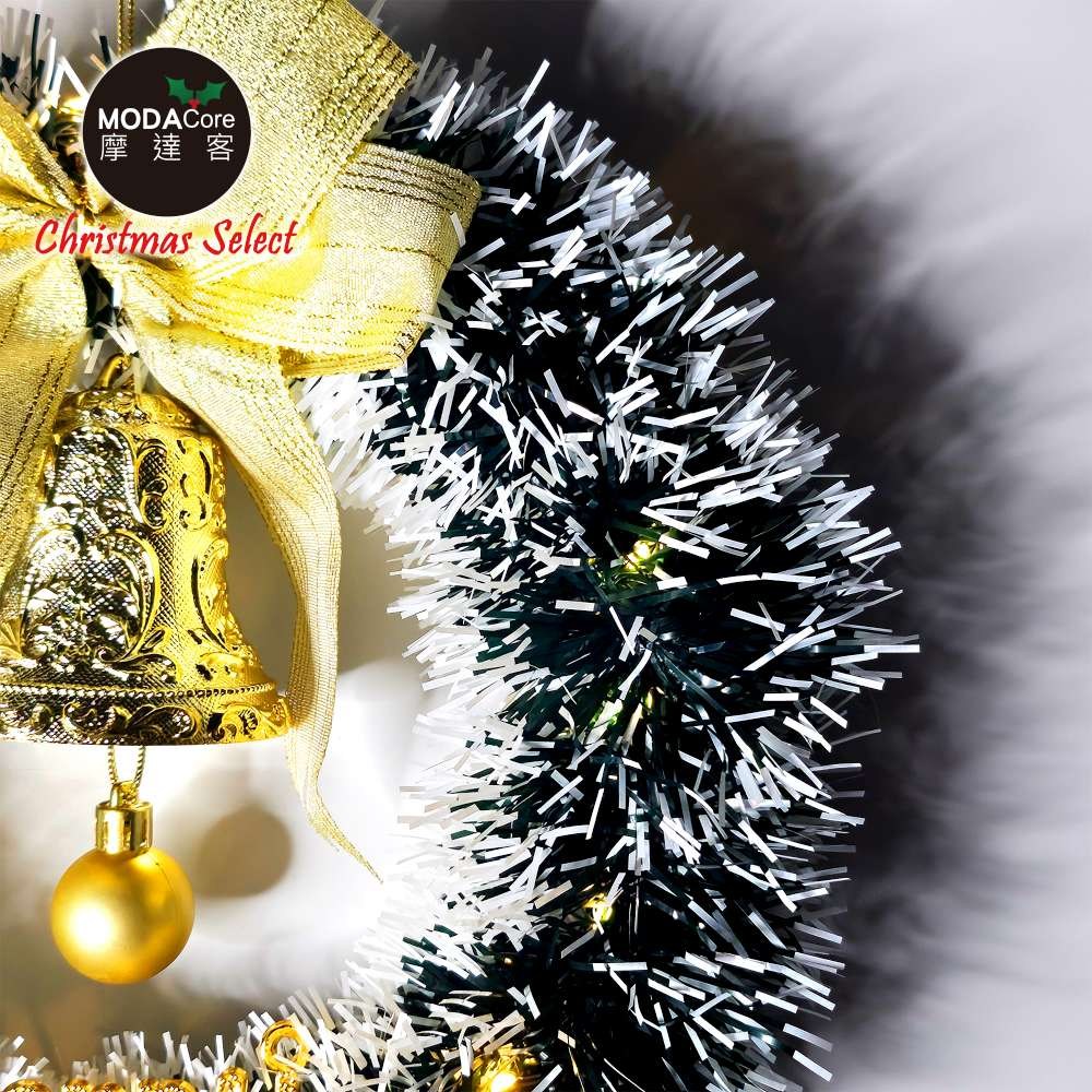 摩達客 11吋風尚雅墨綠刷白系金蔥彎絲聖誕花圈+20燈LED暖白光燈串 本島免運費