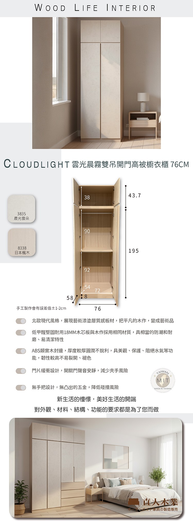 直人木業-CLOUDLIGHT雲光晨霧高被櫥衣櫃組152公分(單吊+三抽)