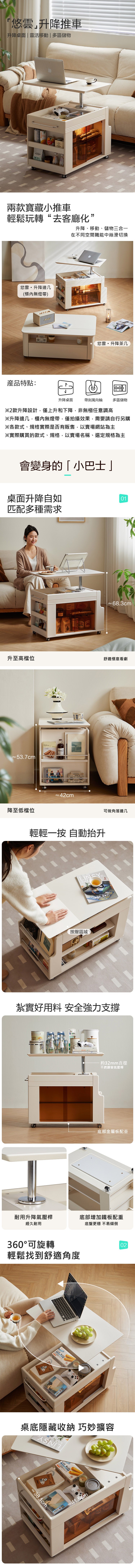 【慢慢家居】旗艦款-氣壓式無段升降移動邊桌 (可折疊 充電 升降桌)氣壓升降桌-白桌面