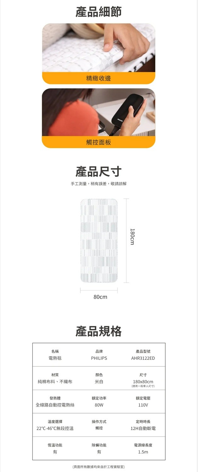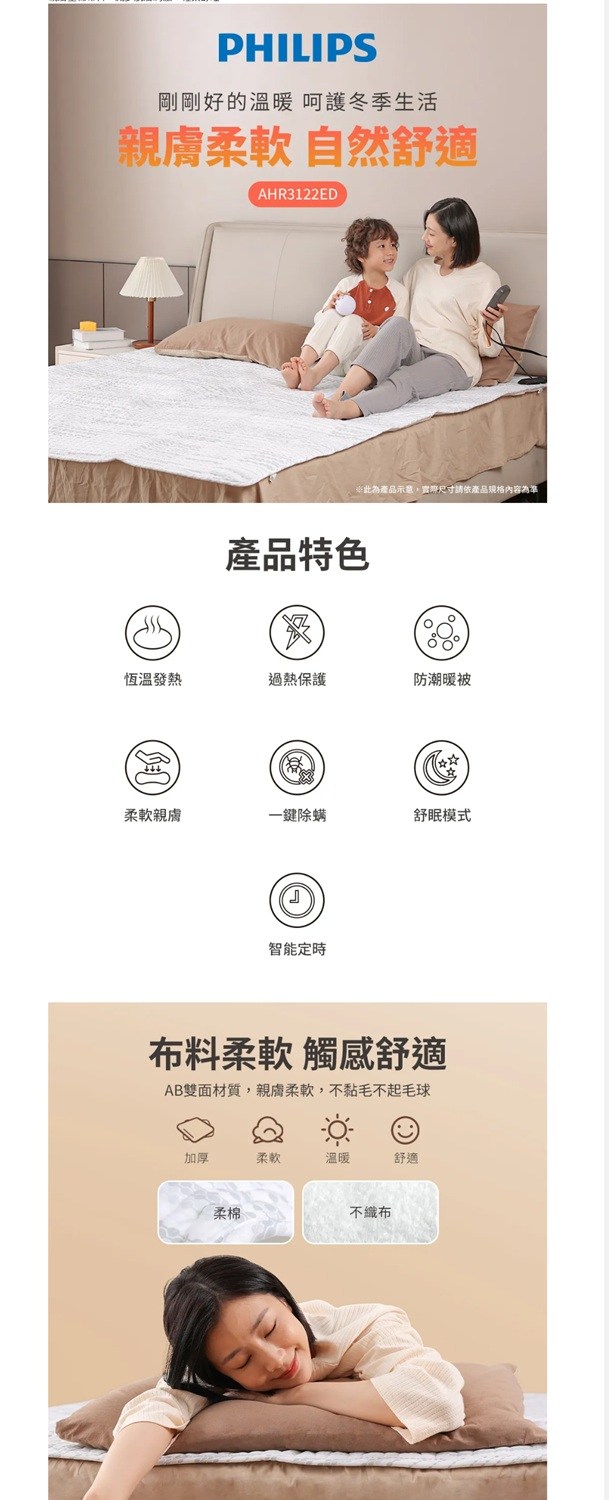飛利浦單人電熱毯1800X800電暖器AHR3122ED