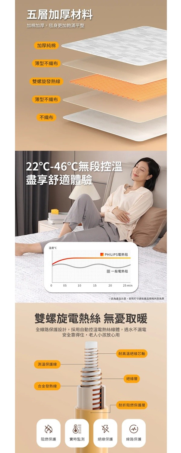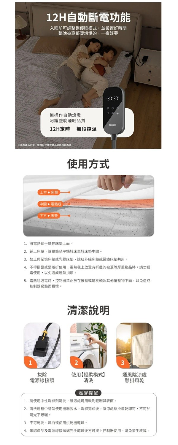 【Philips 飛利浦】【AHR3122ED】單人電熱毯1800X800電暖器