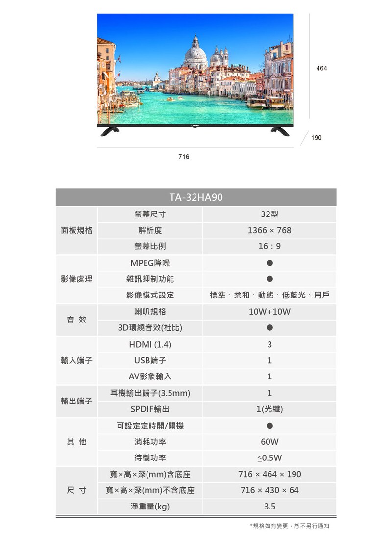TATUNG大同 32吋HD顯示器TA-32HA90 含標準安裝