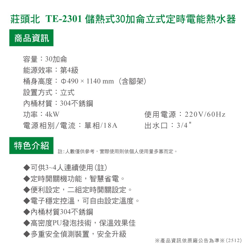 (全省安裝)莊頭北30加侖直立式4KW定時儲熱電TE-2301熱水器TE-2301-4KW ★送7-11商品卡2900元