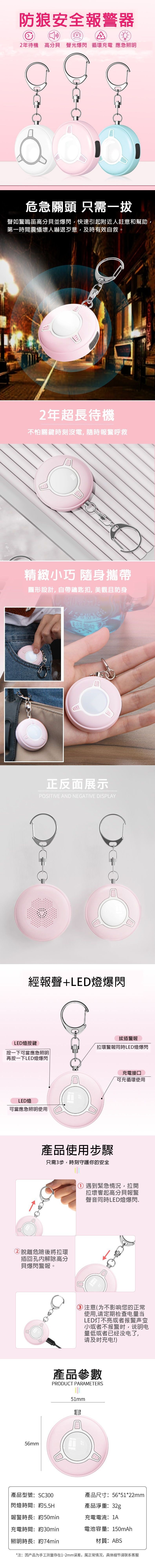 功能:高分貝警報、LED應急燈、爆閃警示
