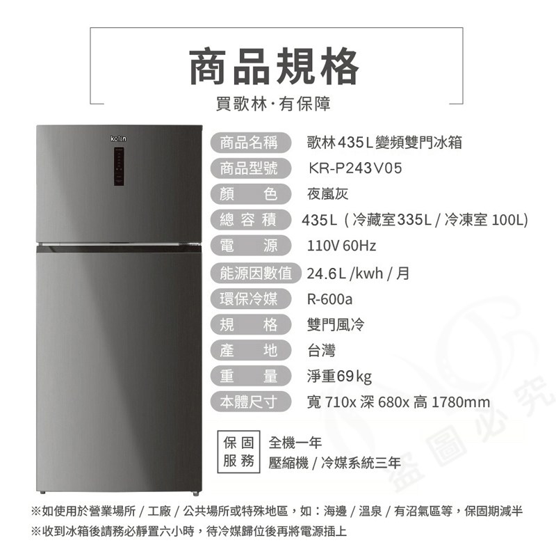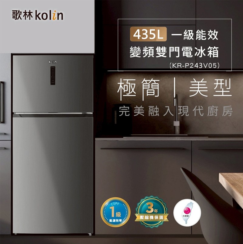 Kolin 歌林 435公升一級變頻雙門冰箱 KR-P243V05 含拆箱定位+舊機回收 偏遠地區費用另計